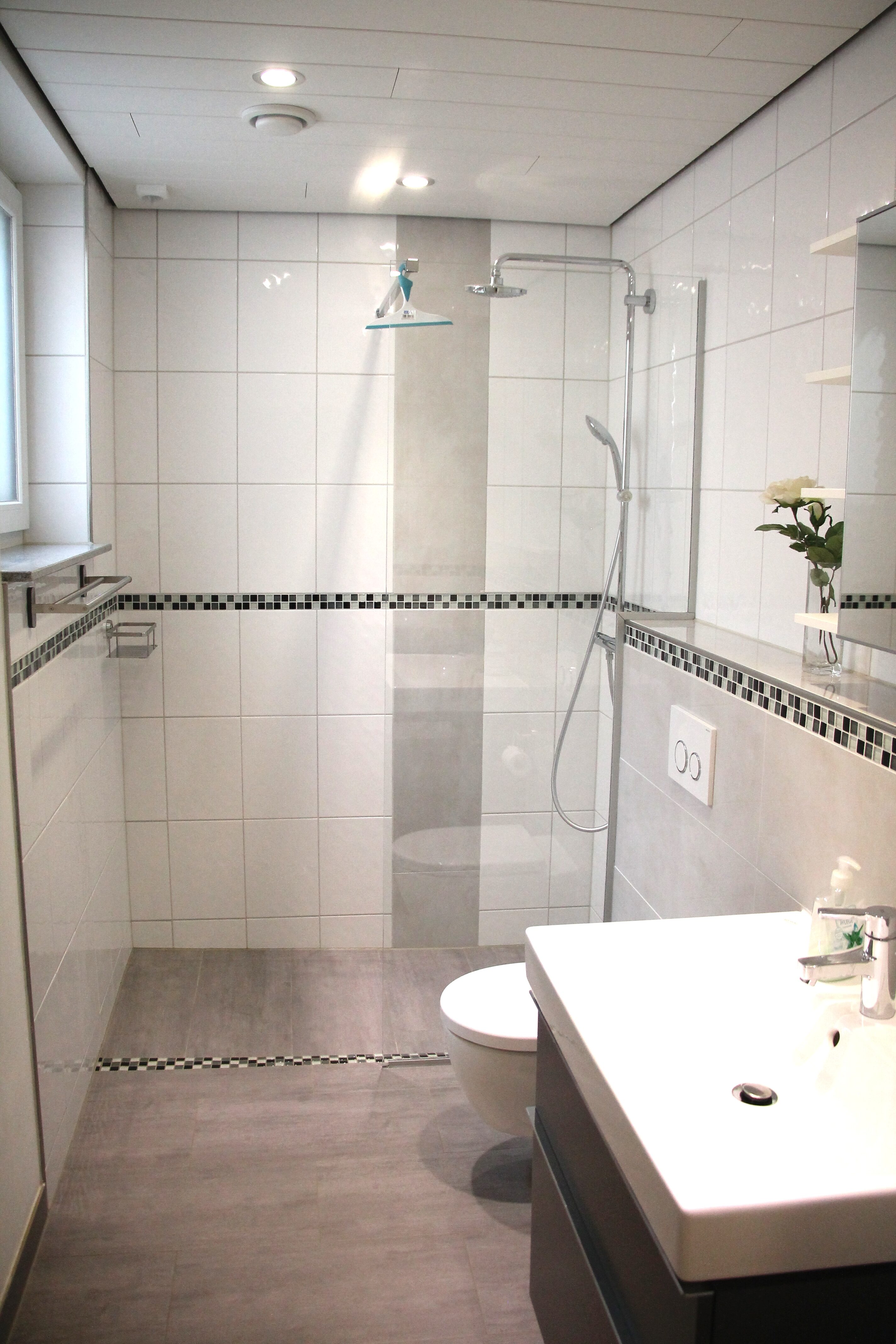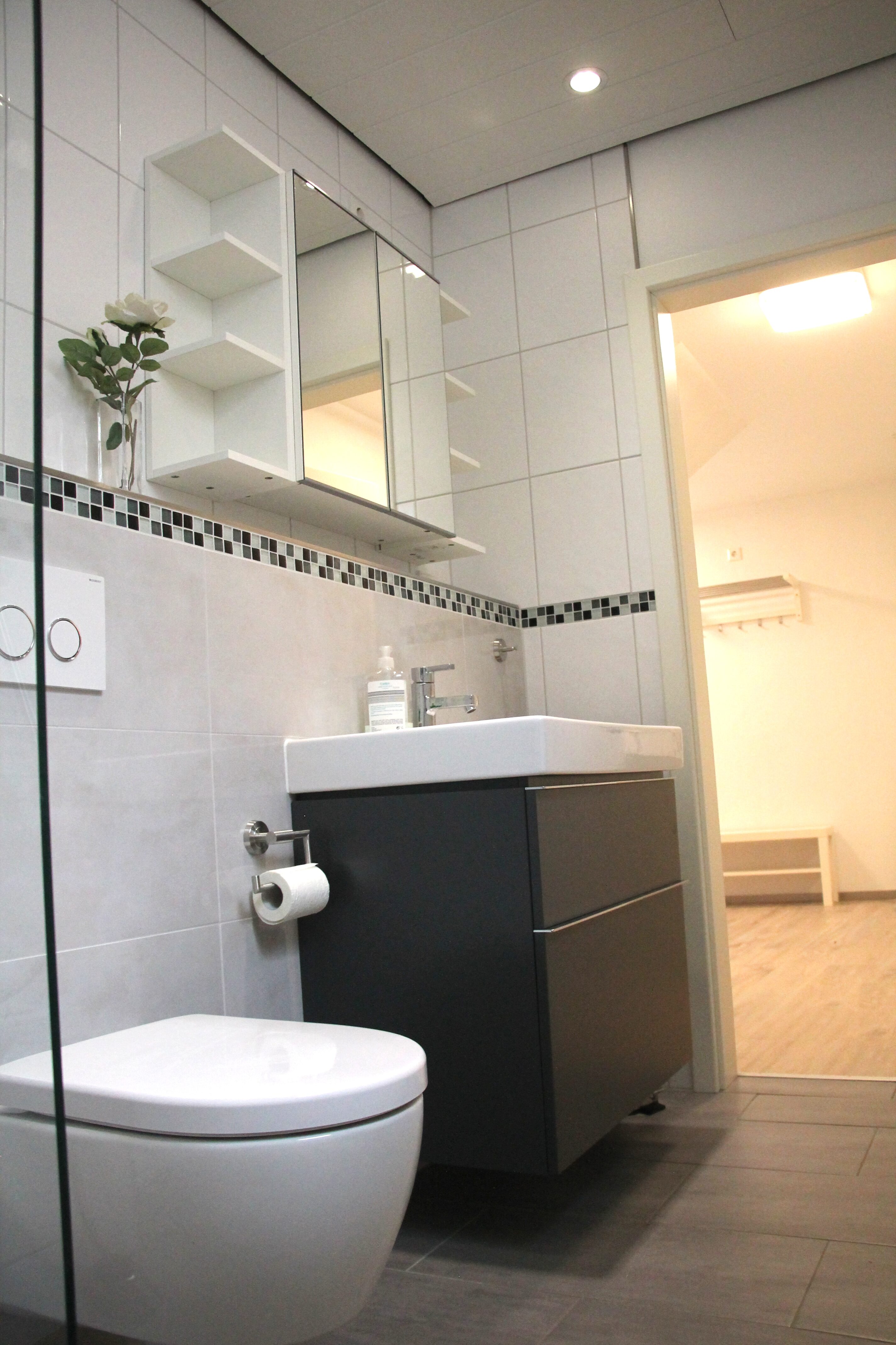 Unser Badezimmer zeigt sich in einem modernen weiß/grauen Design. Starten Sie frisch in den Tag oder entspannen nach einem ausgedehnten Ausflug.