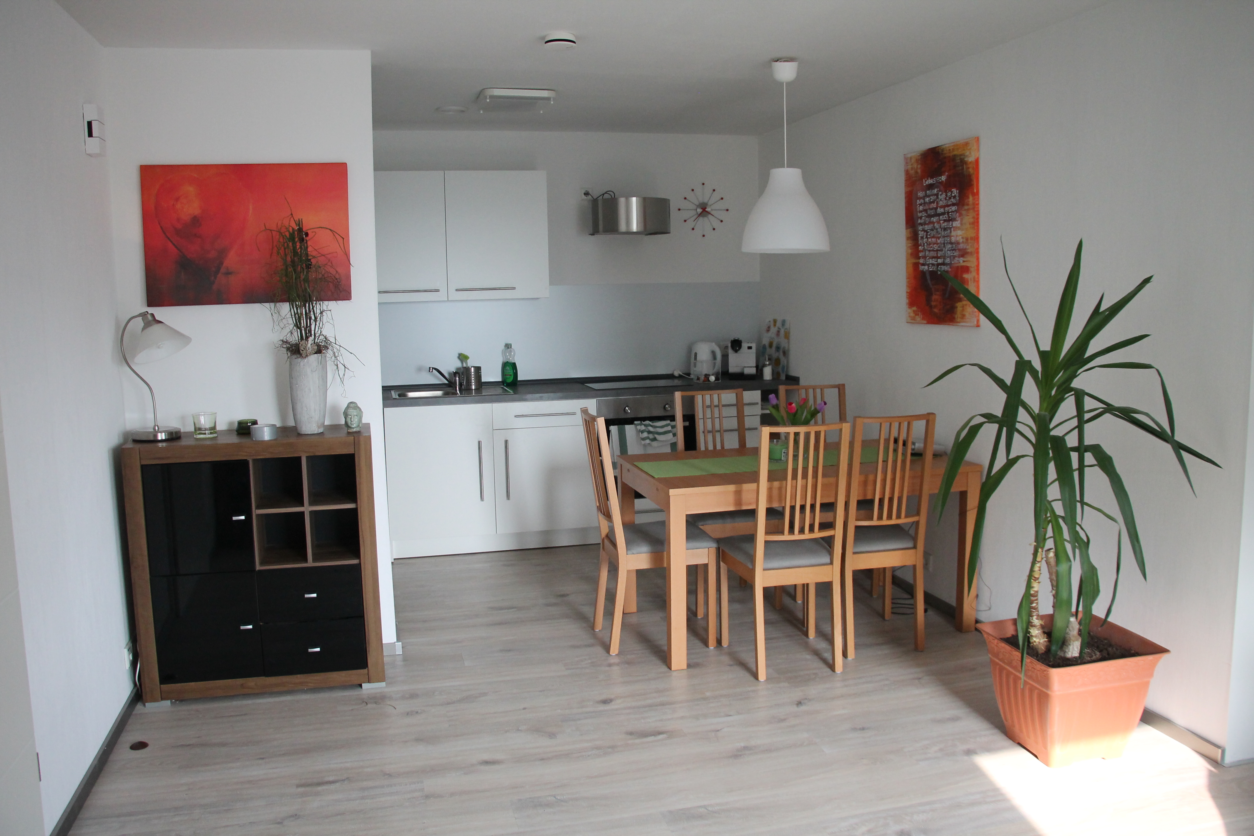 Our living/dining area offers space for is also the entrance area of our apartment. The well-equipped Kitchenette with the integrated Dining Table invites you to an extensive Breakfast before the Day starts. In the living area with sofa bed, the evening can end or you can simply relax in between.